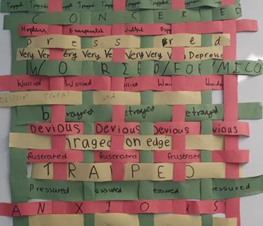 The second workshop looked more closely at Penelope’s deception of the suitors. The session incorporated creative writing to consider the views of the suitors, maids and Penelope on her trickery. Generally, students seemed most interested in the boredom and frustration of the maids, the feeling of entrapment of Penelope and the rage and petulance of the suitors! Students also contributed to paper tapestry-making to examine Penelope’s feelings, putting emotions on strips of paper and weaving them into a larger frame. Here, weaving was used to explore Penelope’s emotions rather than her capacity for deception.