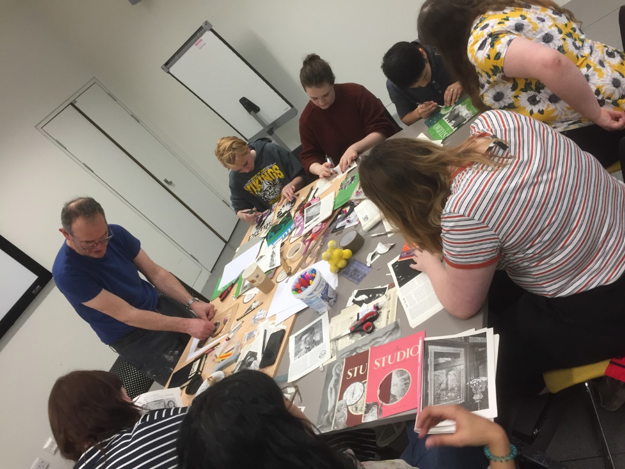 22 Mar 2019On Tuesday 19th March, the Centre for Visual Cultures welcomed internationally acclaimed British artist Neil Gall, who led two masterclasses on collage with students at Royal Holloway.